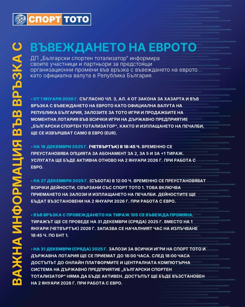 Държавно предприятие „Български спортен тотализатор“ информира своите участници и партньори