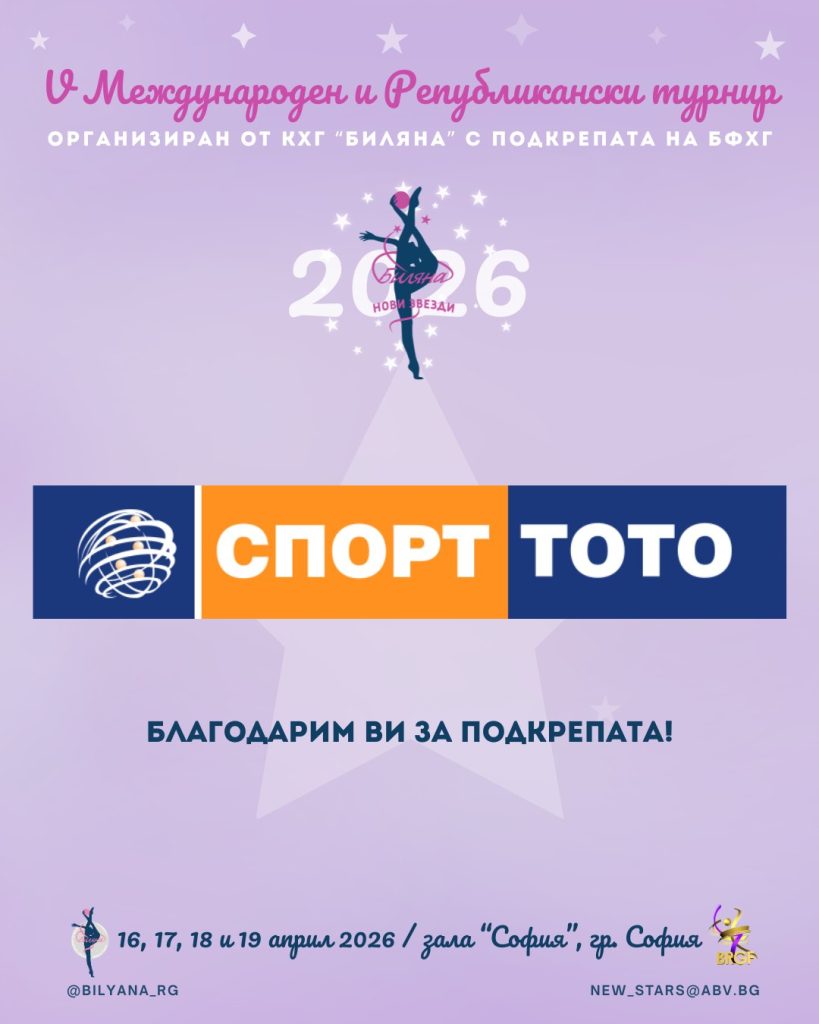 Като официален партньор на едно от най-мащабните събития в календара на спортната гимнастика у нас, Българският спортен тотализатор подкрепя турнира „Нови звезди“ – сцена, която събира над 1500 млади гимнастички от 35 клуба и участнички от Молдова, Гърция и Сърбия. Събитието се организира от Биляна Проданова и КХГ „Биляна“ с подкрепата на Българската федерация по художествена гимнастика и утвърждава мястото си като ключова платформа за развитие на млади таланти.