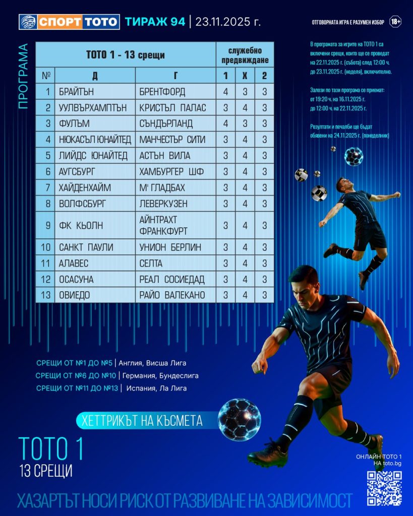 *Футболни залози за тираж 94 на Тото 1 могат да се направят до 12:00 ч. в събота, 22 ноември. Напомняме, че минималният залог е само 0,20 лв., а джакпотите в трите игри продължават да се натрупват и предлагат значителни печалби.