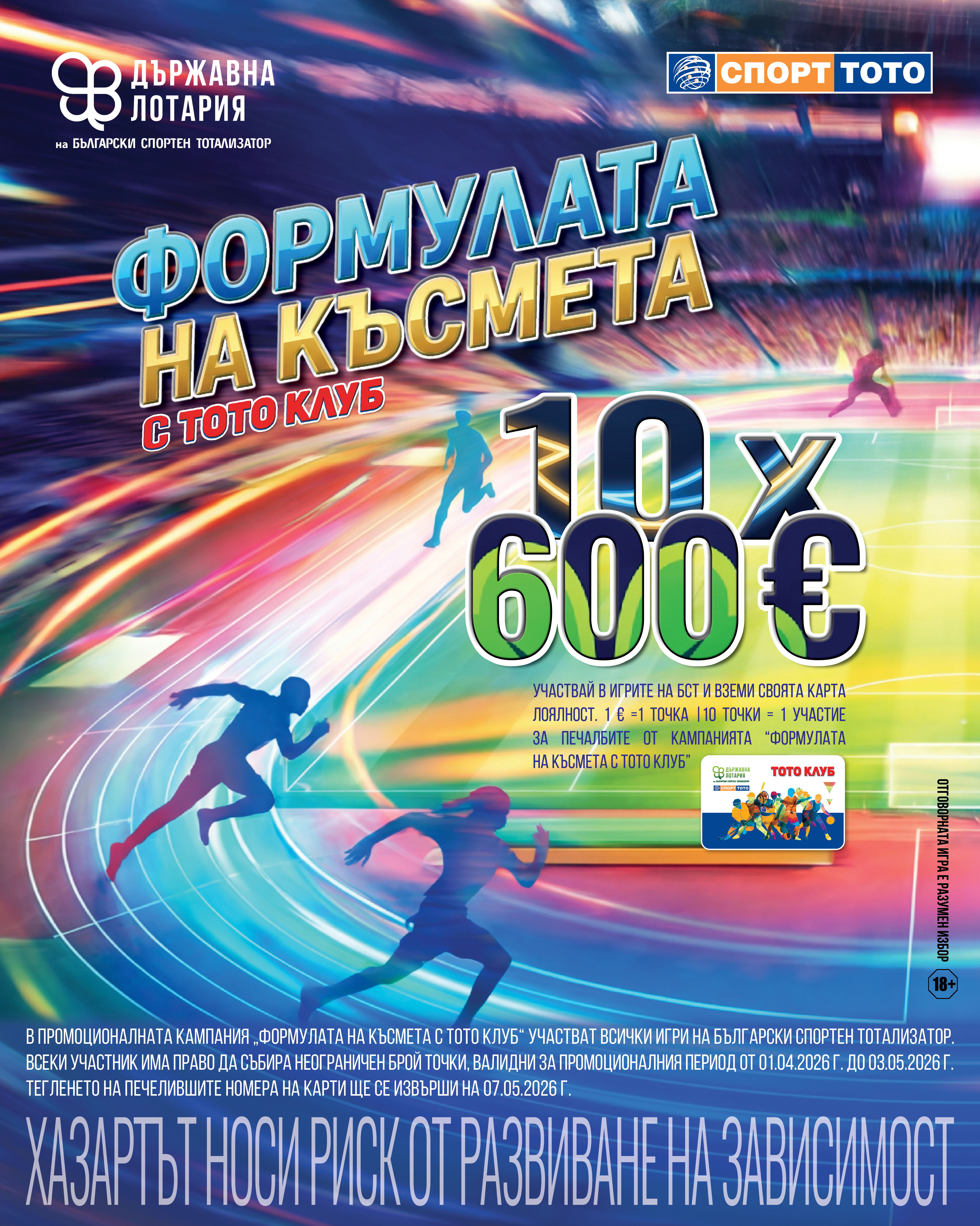 Участие в нея могат да вземат всички клиенти, които са се регистрирали в програмата за лоялност „ТОТО КЛУБ“, по един от начините посочени в Общите правила и условия. Всеки участник в игра, извършил покупка на залог/талон за участие в нея, в периода 01.04.2026 г. до 03.05.2026 г. на стойност равна или по-голяма от 1,00 /едно/ евро, получава /натрупва в потребителския си профил/ по 1 /една/ бонус точка за всеки 1,00 /едно/ евро покупка /т.е., ако покупката е на стойност 2,00 евро, участник получава 2 бонус точки; ако покупката е на стойност 3,00 евро, участник получава 3 бонус точки. Ако покупката е на стойност 3 евро и 10 евроцента, то той получава 3 бонус точки, като остатъчната стойност /10 евроцента/ не се вземат предвид при изчисляване на бонус точките, които се получават при следваща покупка/. Бонус точките се получават за извършена покупка на залог/талон за участие в игра от посочените в чл. 1, поотделно и се отразяват във всяка една квитанция за направен залог поотделно /т.е. ако е направена покупка за една игра на стойност 2 евро и 25 евроцента, още една покупка за същата или друга игра, на стойност 3 евро и 40 евроцента, участник получава 2 бонус точки за първата покупка и 3 бонус точки за втората/. Всеки събрани 10 /десет/ бонус точки дават 1 /един/ шанс на съответния участник за спечелване на допълнителна печалба от Играта /т.е. при събрани 20 /двадесет/ бонус точки, участник има 2 /два/ шанса; при събрани 30 /тридесет/ бонус точки, участник има 3 /три/ шанса за спечелване на допълнителна печалба и т.н./.