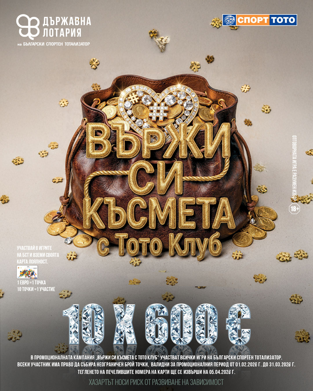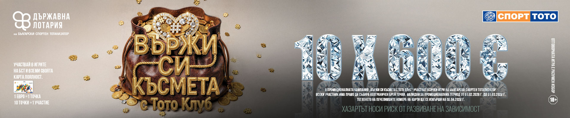 На 01.02.2026 г. стартира новата кампания от програмата за лоялни клиенти на Български спортен тотализатор – „ВържиСиКъсмета с Тото Клуб“. Промоционалните печалби на кампанията са общо 10 броя на обща стойност 6 000 евро, разпределени: 10 броя парични печалби на стойност 600 евро всяка.